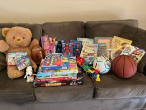Basketballs, Soccer Balls, Footballs, Board Games, Dolls, Cars, Trains, Books, Art supplies, New Stuffed Animals, and LEGO’s