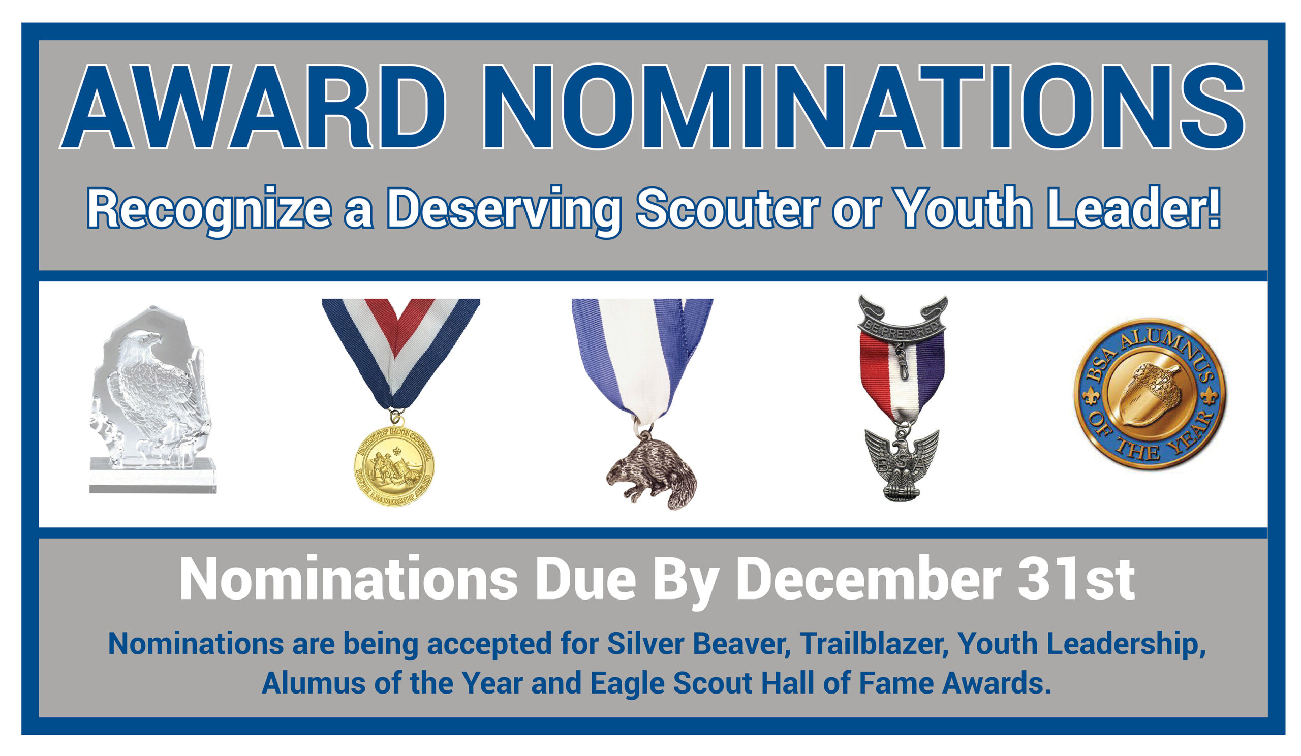 We are currently accepting nominations for the Silver Beaver Award, Trailblazer Award, Youth Leadership Award, Alumnus of the Year Award, and Eagle Scout Hall of Fame.
