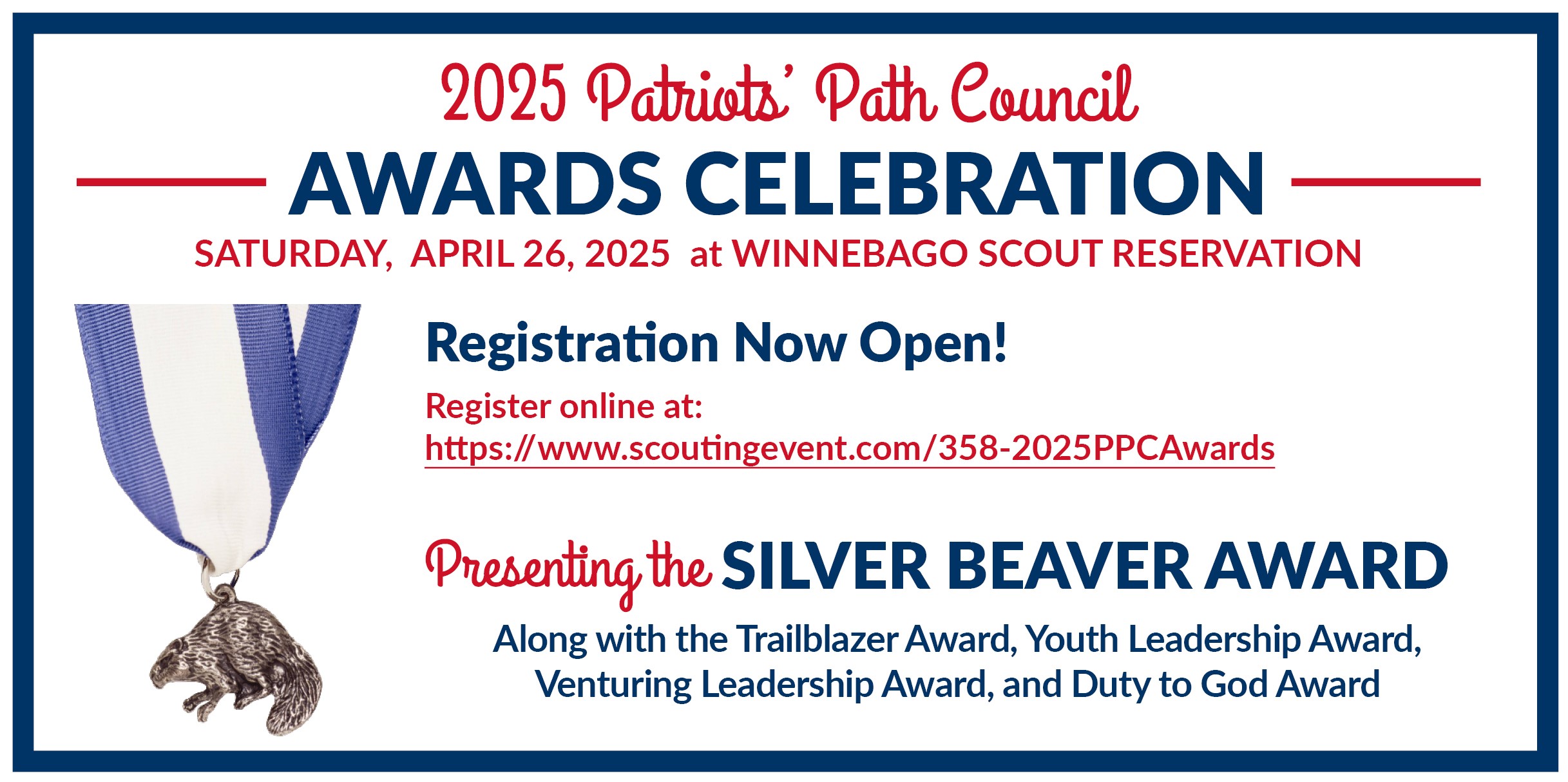 On Saturday, April 26, 2025, at Winnebago Scout Reservation, we will be presenting the 2025 SILVER BEAVER AWARDS! We will also be presenting the TRAILBLAZER AWARDS, YOUTH LEADERSHIP AWARDS, VENTURING LEADERSHIP AWARD, and COUNCIL DUTY TO GOD AWARD. Please plan to come out and honor these dedicated volunteers and youth leaders.