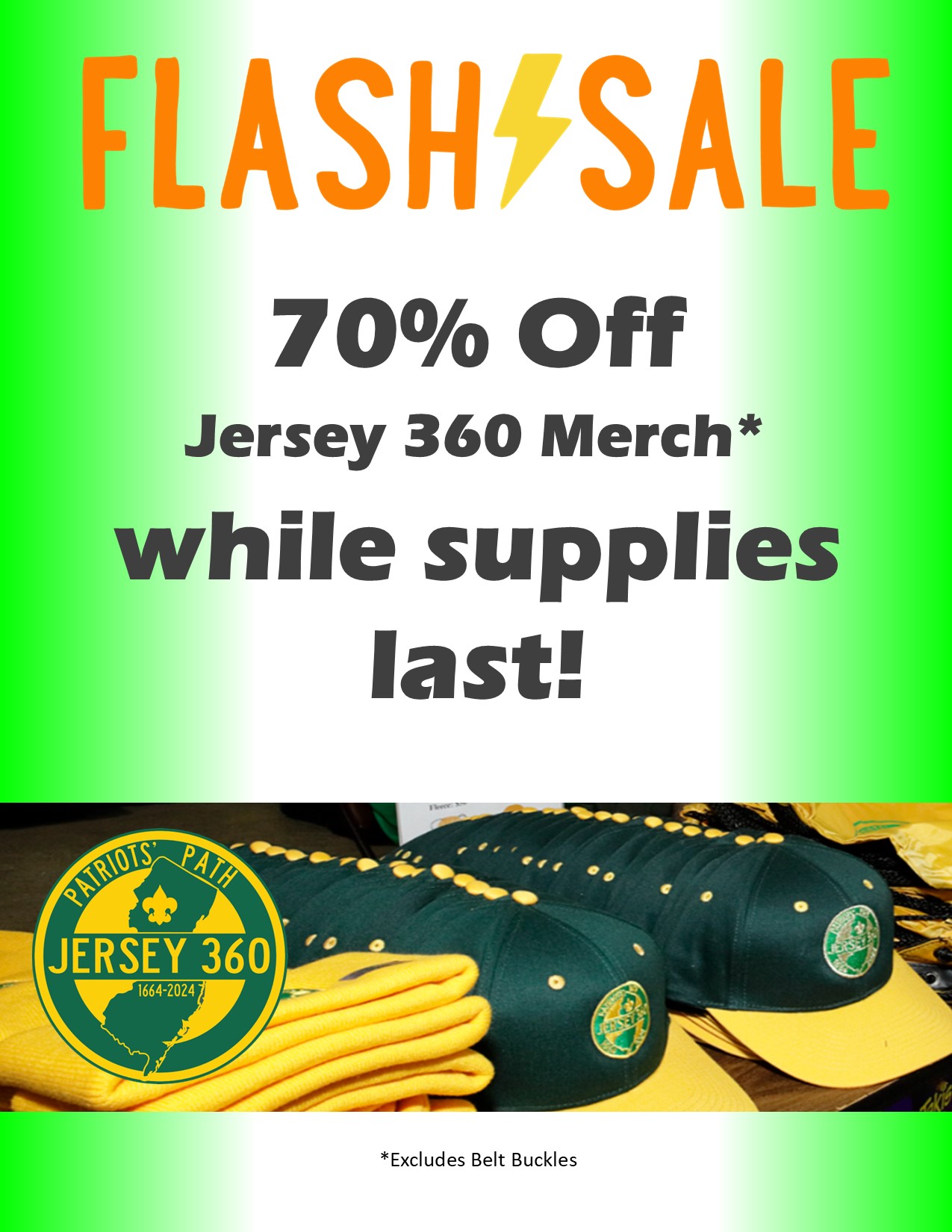 Jersey 360 Camporee Miss out on merchandise from the Jersey 360 Jamboree? Now while supplies last, stop into the Kurland Family Scout Shop, Mountainside Scout Shop, or order online for 70% Off Jersey 360 Merchandise (excluding belt buckles)! 2025 Camp