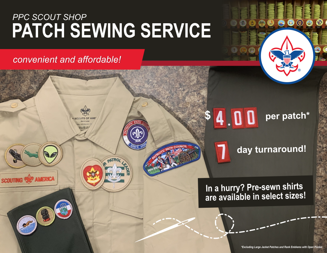 In need of a new uniform shirt for an upcoming event or for your week of Summer Camp? Head to either of the Patriots’ Path Council Scout Shops and take advantage of our sewing service!